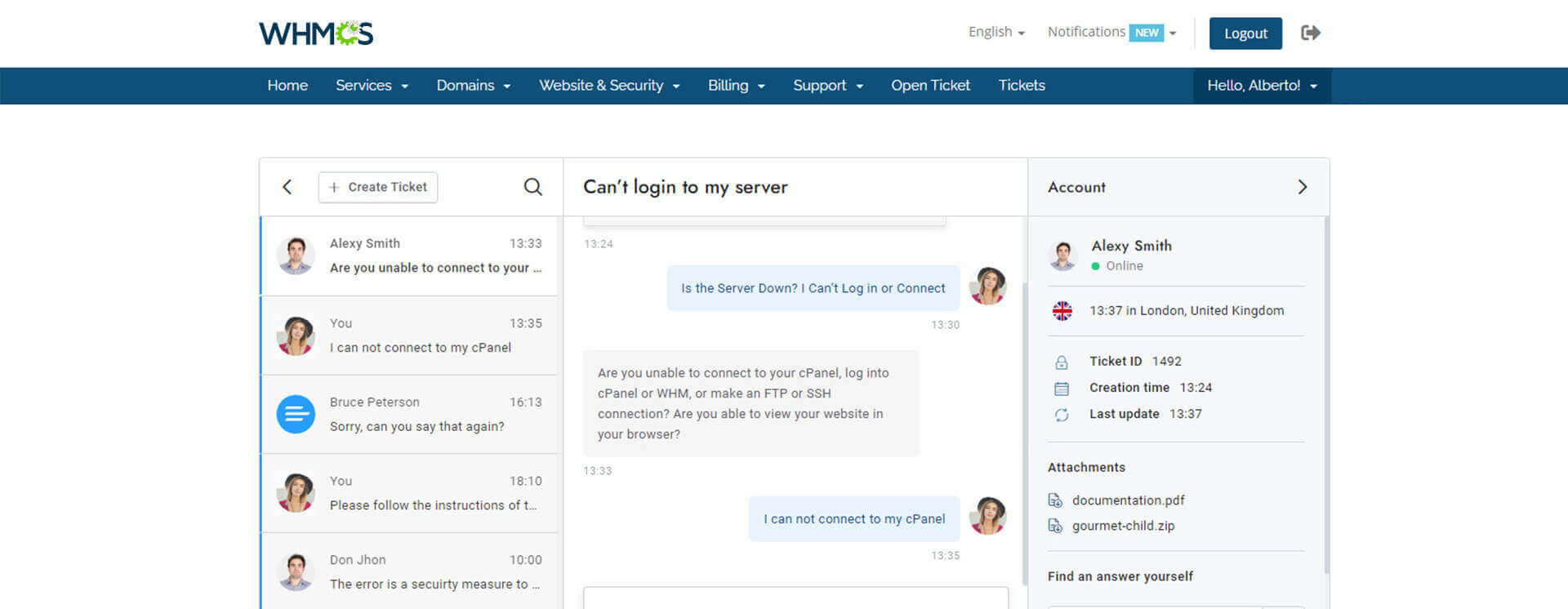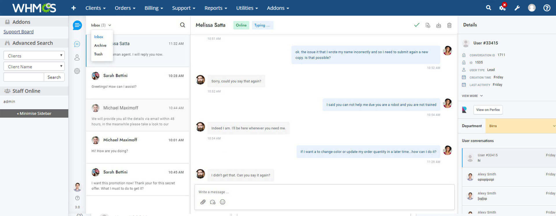 Allow your customers to connect with your WHMCS staff in real-time with a professional chat and save time with a smart bot that provides automated answers to the client's questions.