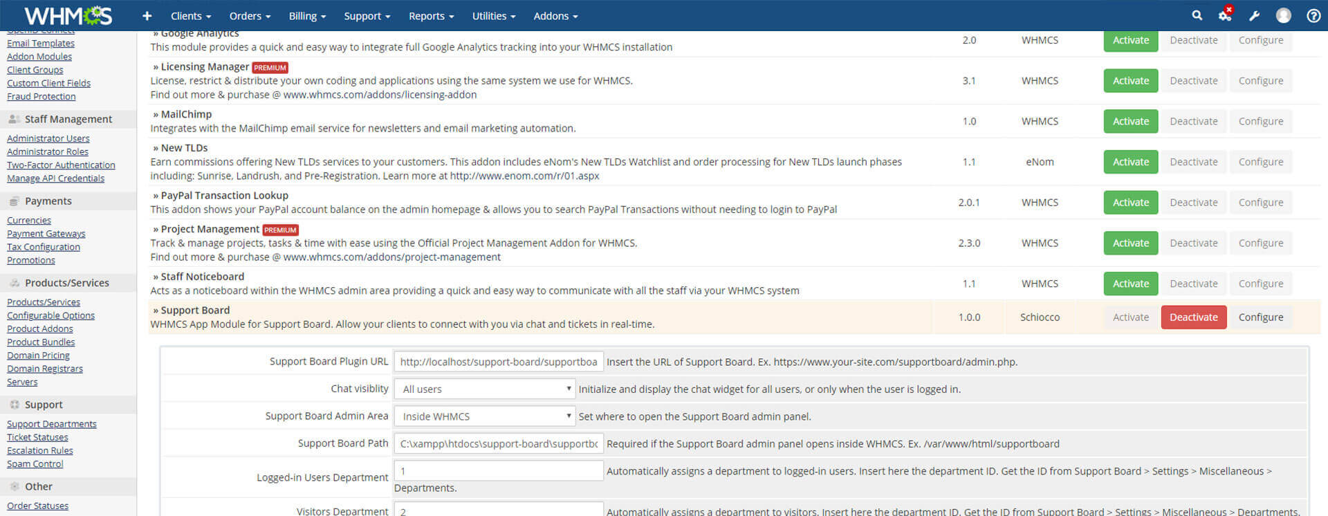 Option to display a menu item linked to the Support Board admin area in the WHMCS admin menu.